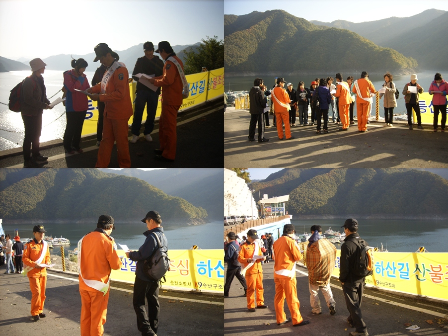소양호수난구조대(대장 문종찬)에서는 본격적인 단풍철이 도래함에 따라 산불 및 산악사고 위험증가에 대비하기 위하여 산불조심 캠페인과 산악사고시 대처요령 홍보 행사를 실시하였습니다.