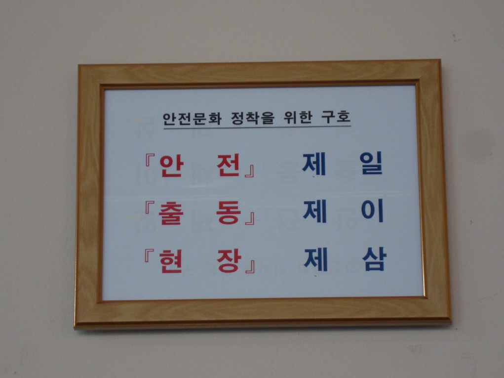각종 사고현장에서의 안전을 생활화하기 위해 근무교대시 안전구호를 제창하고 있습니다.