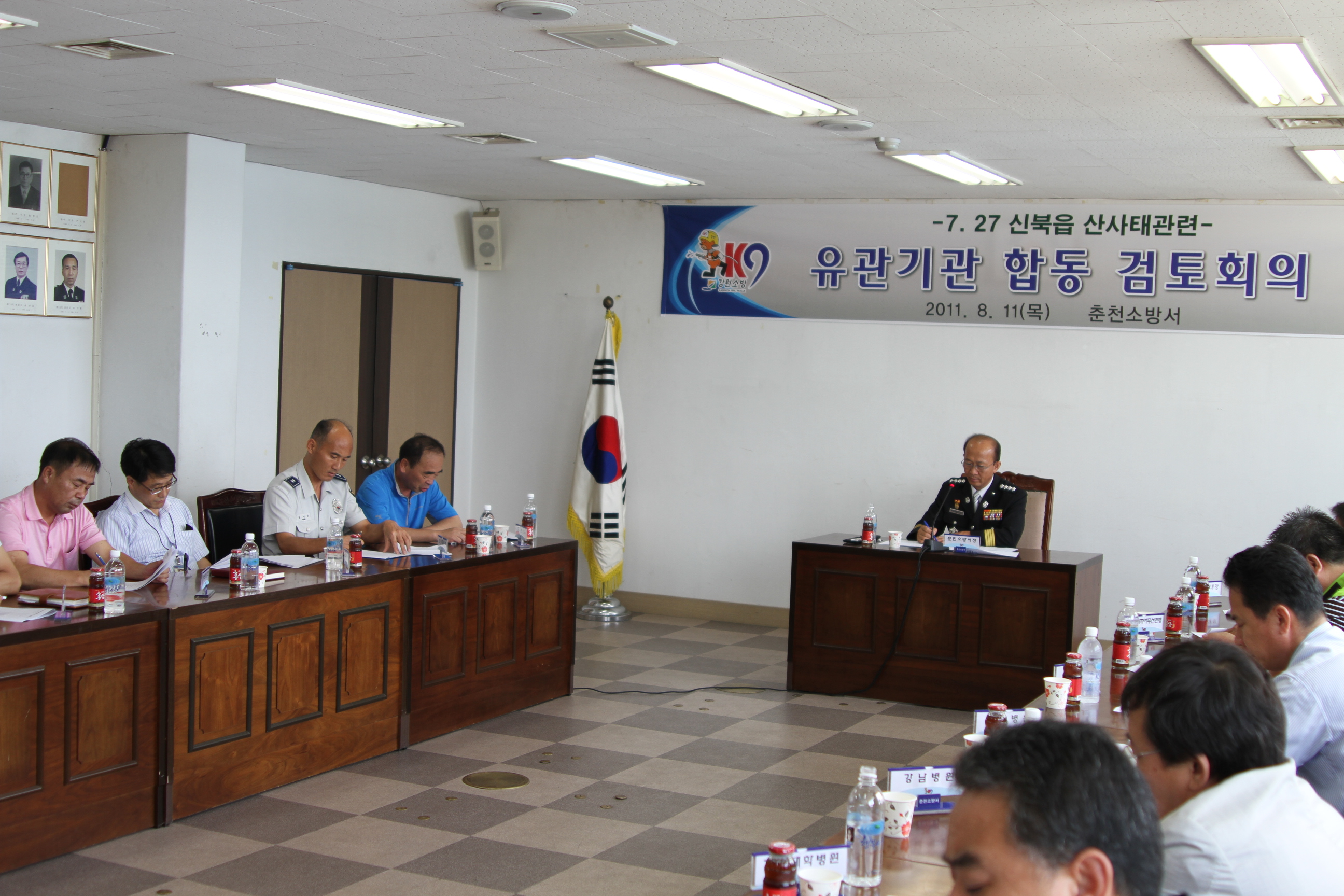 춘천소방서(서장 조완구)는 11일 14:00시 춘천소방서 소회의실에서 유관기관 합동 검토회의를 가졌습니다. 회의 주제는 7월 27일 신북읍 천전리에서 발생한 산사태 재난현장과 관련하여 유관기관별 대응활동에 대해 토론하고 향후 대형 재난 발생시 협조사항등을 논의하였습니다.