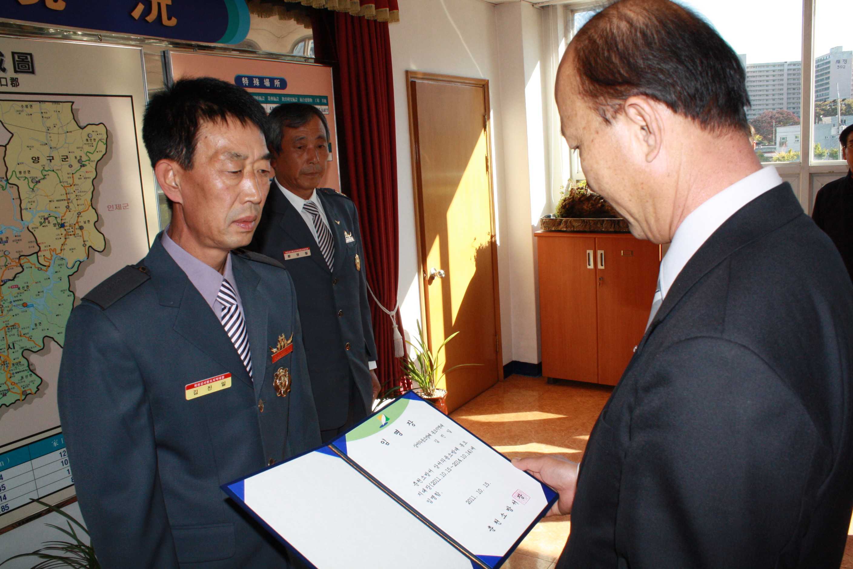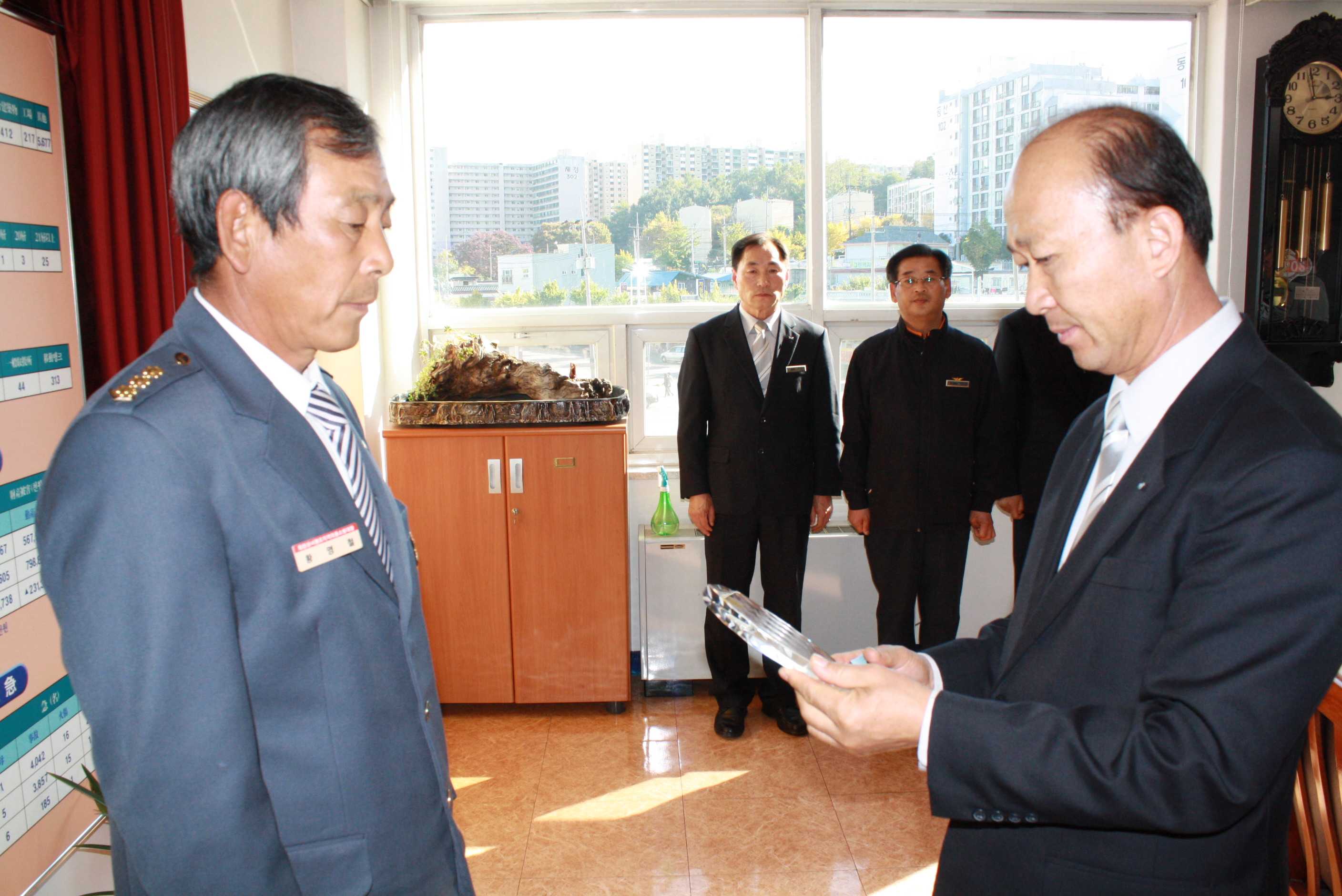 취임하시는 김진일 지대장님에게는 임명장을 수여하고 당부의 말씀을 전달하였으며, 이임하시는 황영철 전 지대장님에게는 도지사 공로패 및 춘천소방서장 감사패를 수여하고 그동안의 노고에 감사를 드렸습니다.