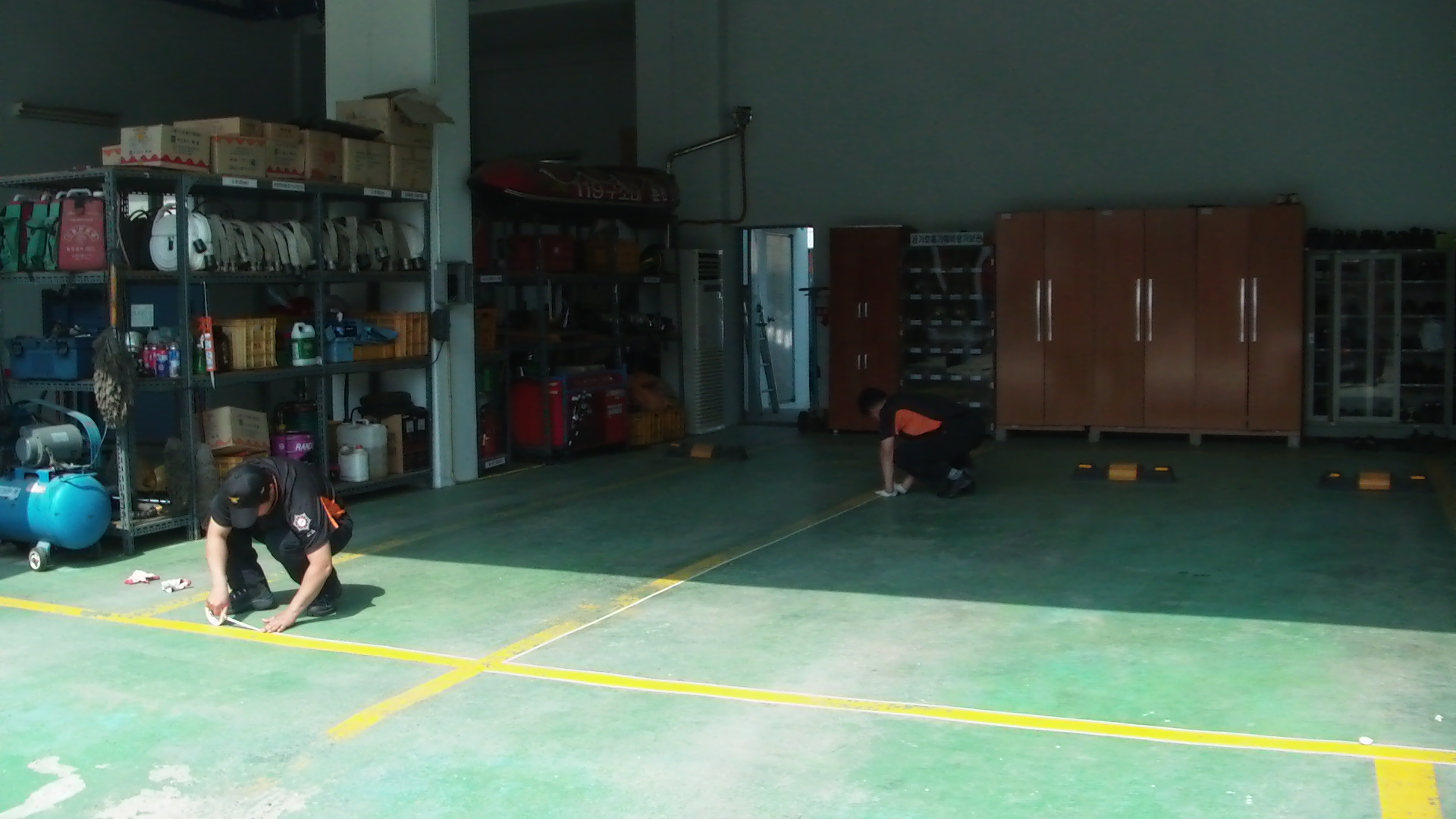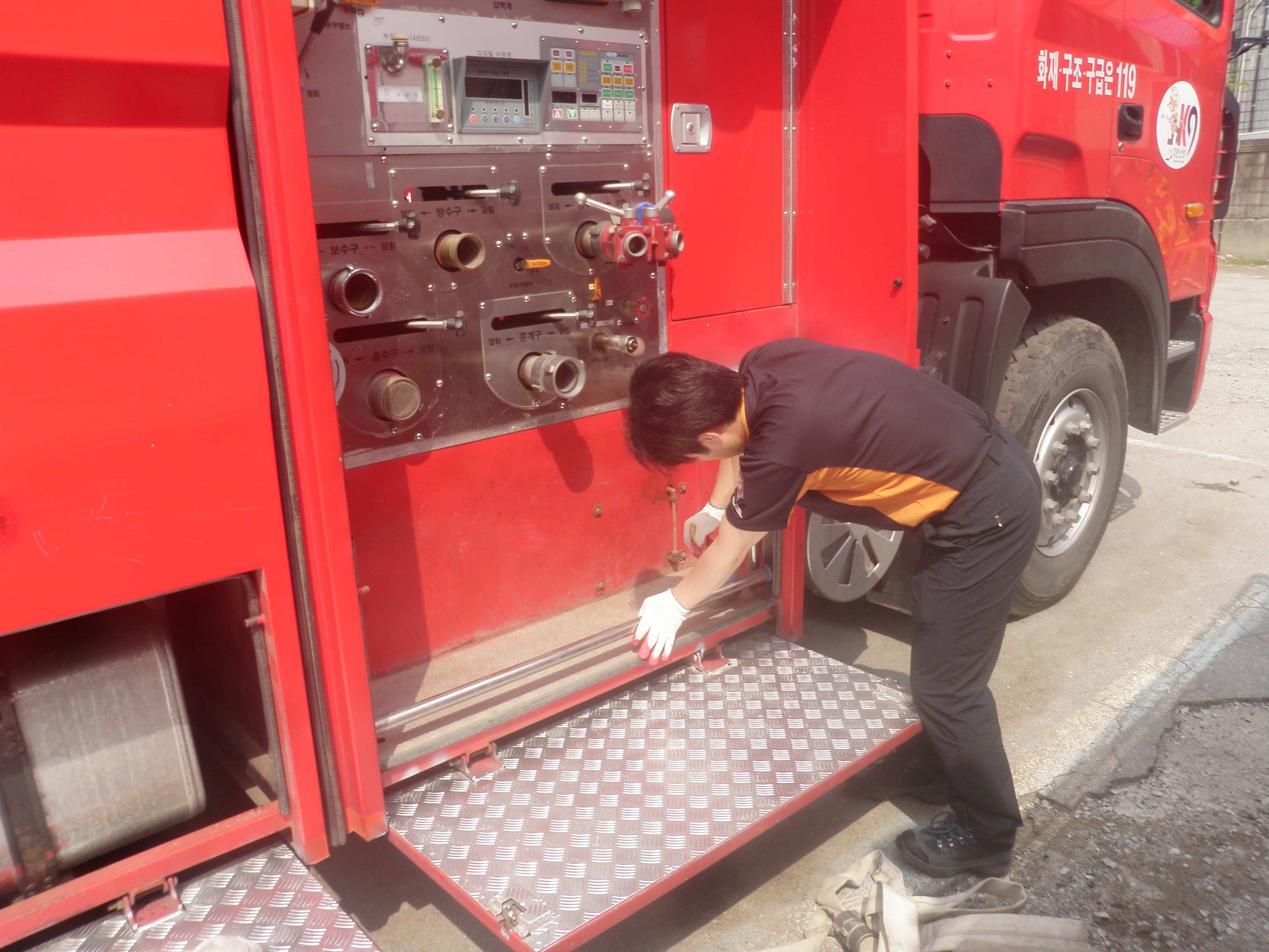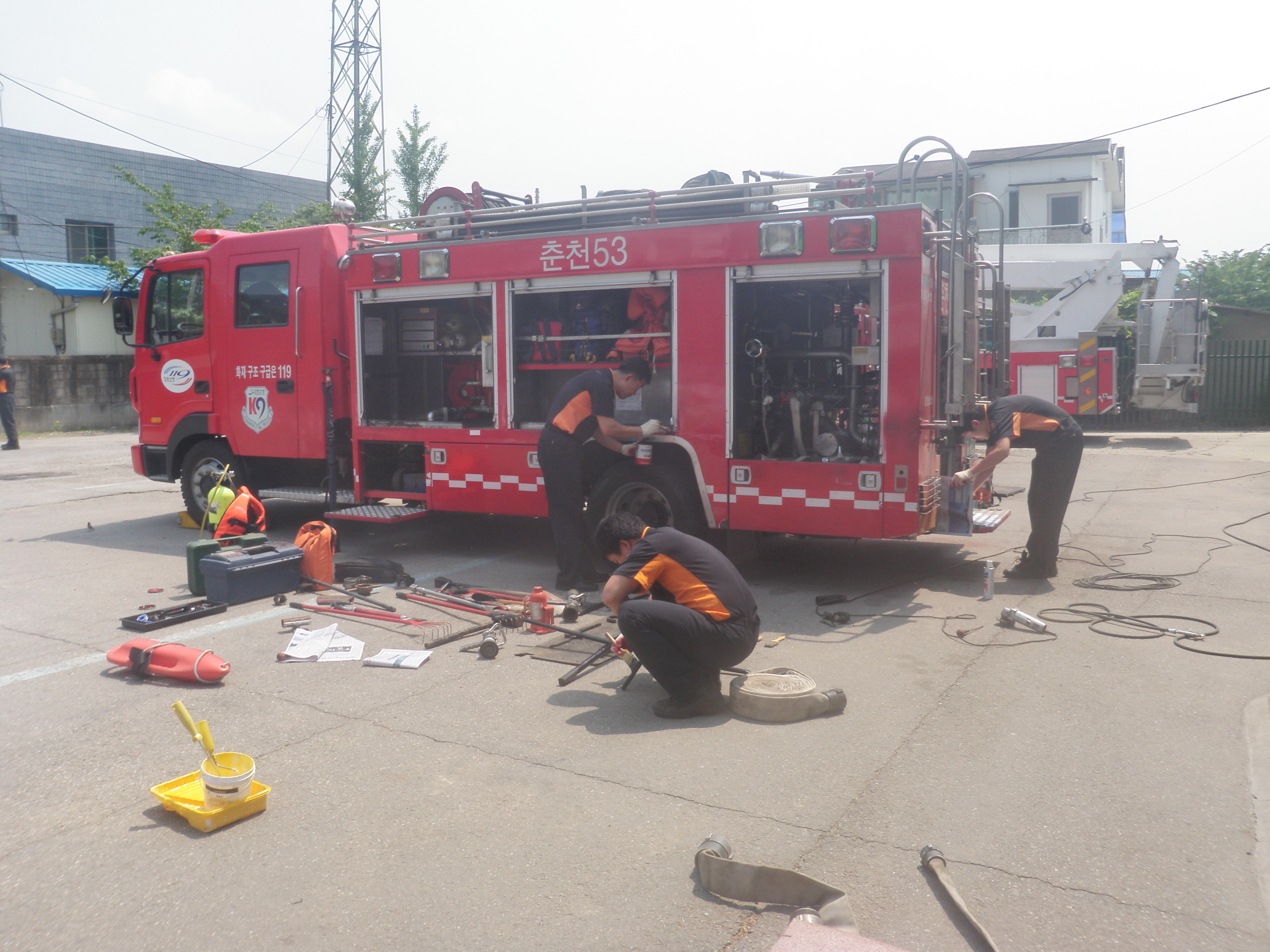 소방차량 외관상태를 점검하여, 부식된 곳을 페인트로 칠하고, 차고안에 경계선를 다시 새롭게 정돈하였습니다.