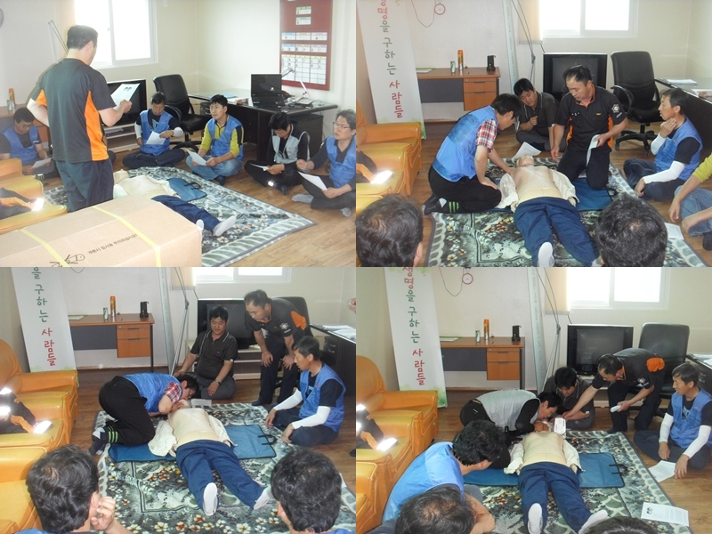 2012년 06월 07일 오후 2시부터 강촌센터 2층 심폐소생술 교육장에서 강촌-창촌 간 도로 건설 현장에서 근무하는 금호건설 현장직원 (김수학외 8명) 분들께 심폐소생술 및 여름철 안전사고 대비 교육을 실시하였습니다.