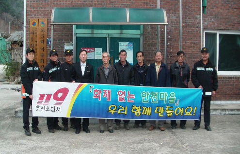 화천119안전센터(센터장:신상건)는 17일 화천읍 아5리 마을에서 이홍기 이장 및 주민들이 참석한 가운데 ‘화재없는 안전마을‘ 현판식을 개최했다. 센터는 이날 소화기와 단독경보감지기를 각 가구에 보급하고 김이장을 명예소방관으로 위촉했다. 화천=김동준 기자