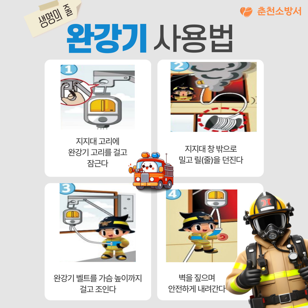 춘천소방서(서장 권혁범)는 10일 겨울철 소방안전대책의 일환으로 올바른 완강기 사용법에 대해 홍보한다고 밝혔다.