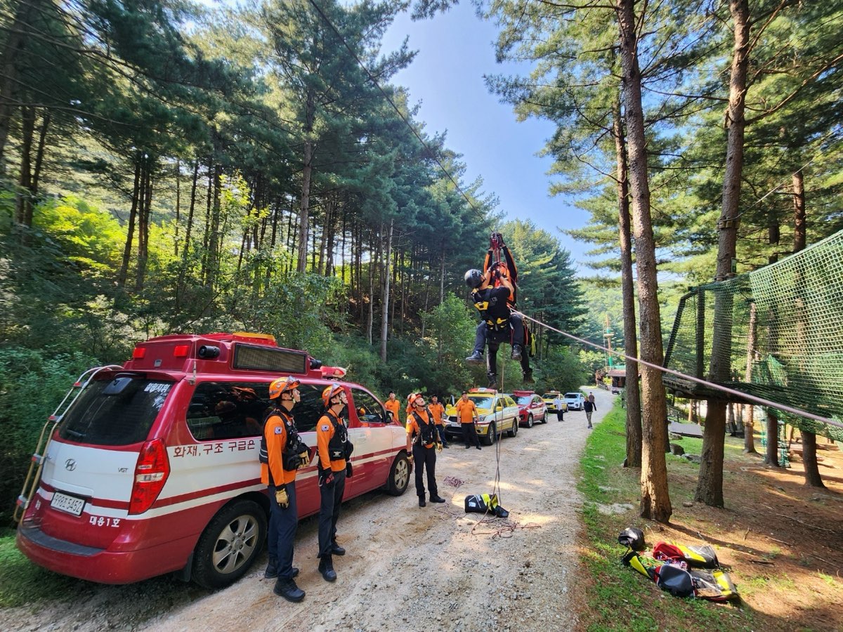 주요 내용은 ▲요구조자 파악 및 사상자 발생 대비 대책강구 ▲소방 차량 진입도로 확인 및 확보 ▲집라인 사고 발생 구조 관련 장비 적응성 확인 ▲ 현장 대원 안전사고 방지 및 안전의식 향상 ▲현장 안전관리 표준지침 활용 인명구조 훈련이다.