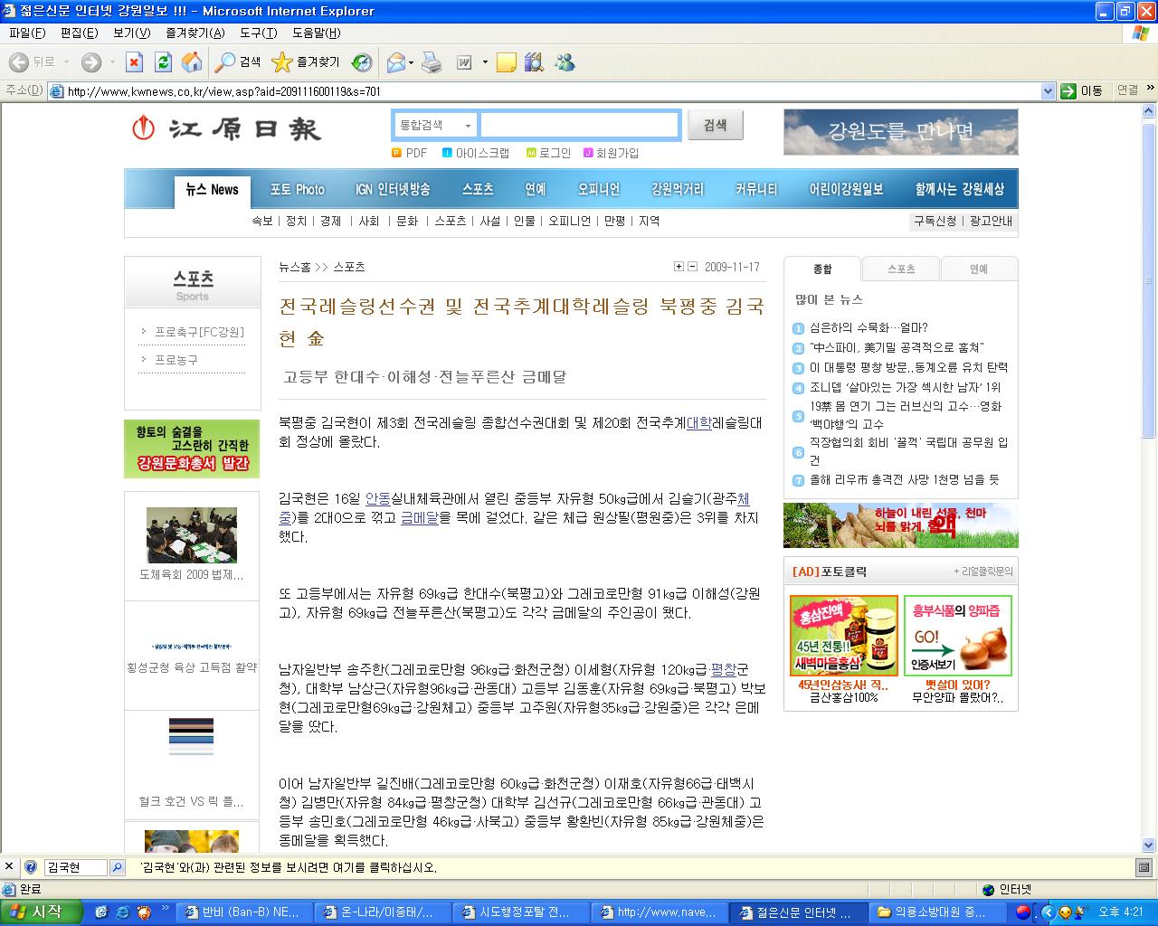 한편 김국현군은 지난 6월에 열린 제38회 전국소년체전에서도 그레코로만형 준결승 도중 입은 부상으로 결승전 출전자체가 불가능했지만 부상의 투혼을 발휘하여 값진 은메달을 획득, 강원도선수단의 메달순위 5위에 공헌한 미래의 강원레슬링 유망주이다 우리모두 김국현 선수가 심권호을 능가하는 세계최고의 레슬러로 성장할수 있도록 많은 격려와 응원을 부탁드립니다. 김국현 선수 화이팅 ^*^ |