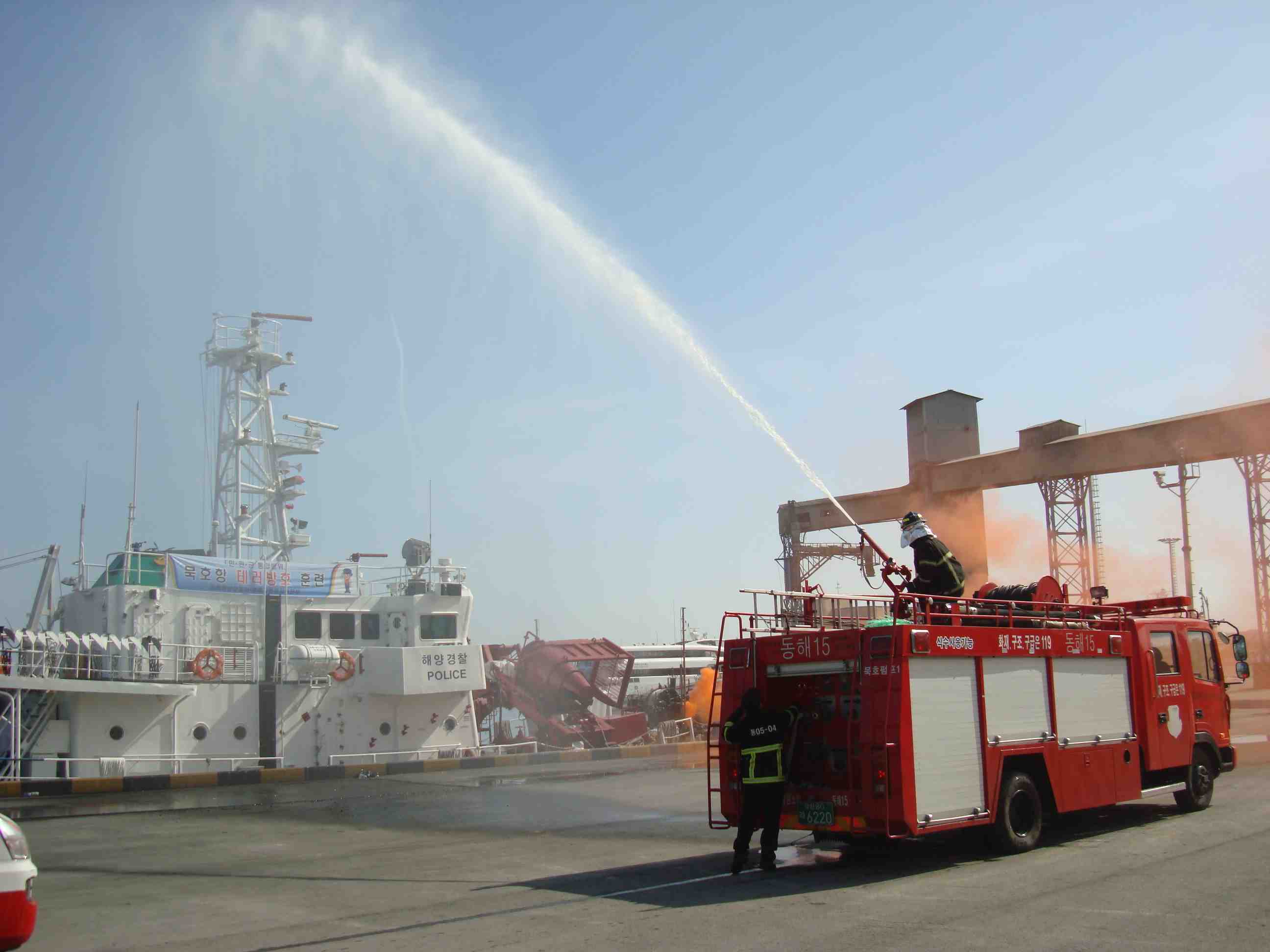 이날 훈련은 테러에 의한 정박 화물선 방화 및 폭파에 따른 화재진압 훈련을 실시하였습니다.