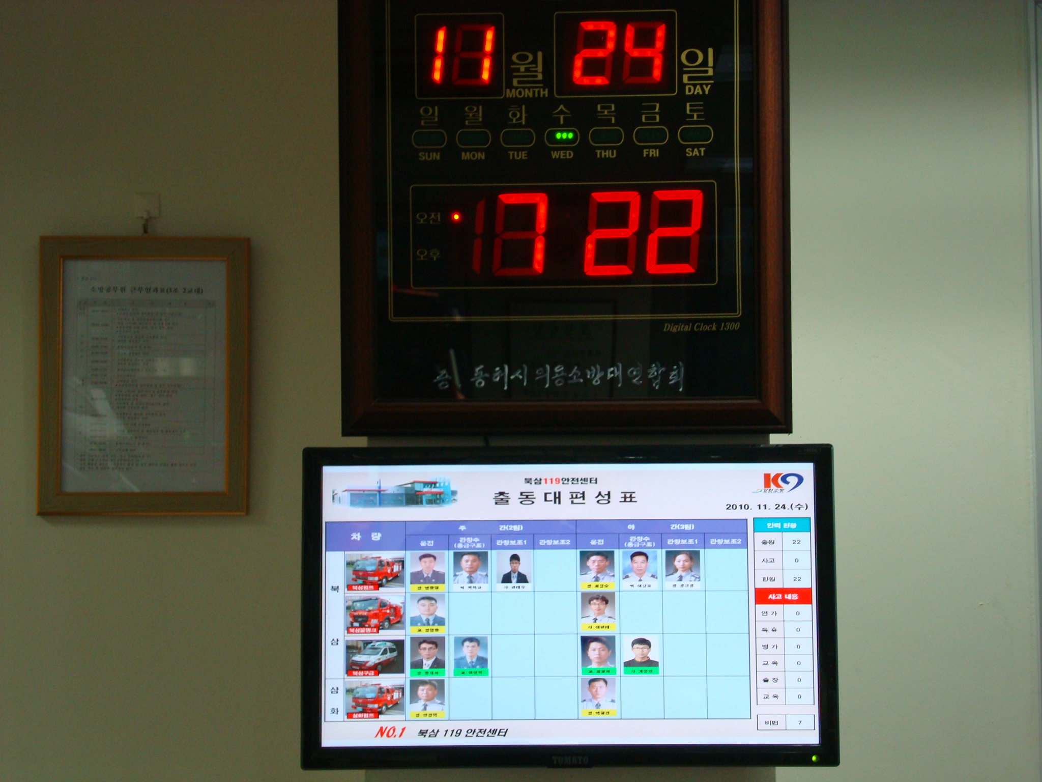북삼119안전센터(센터장 전찬호)는 새롭게 개정된 강원도 소방공무원 근무지침에 따라 출동대편성표를 제작하여 운영하기시작하였다. 벽걸이 모니터와 파워포인트를 이용하여 출동대편성표 외에 일일업무보고 및 공지사항 등을 직원들에게 전달하는데 이용할 계획이다.