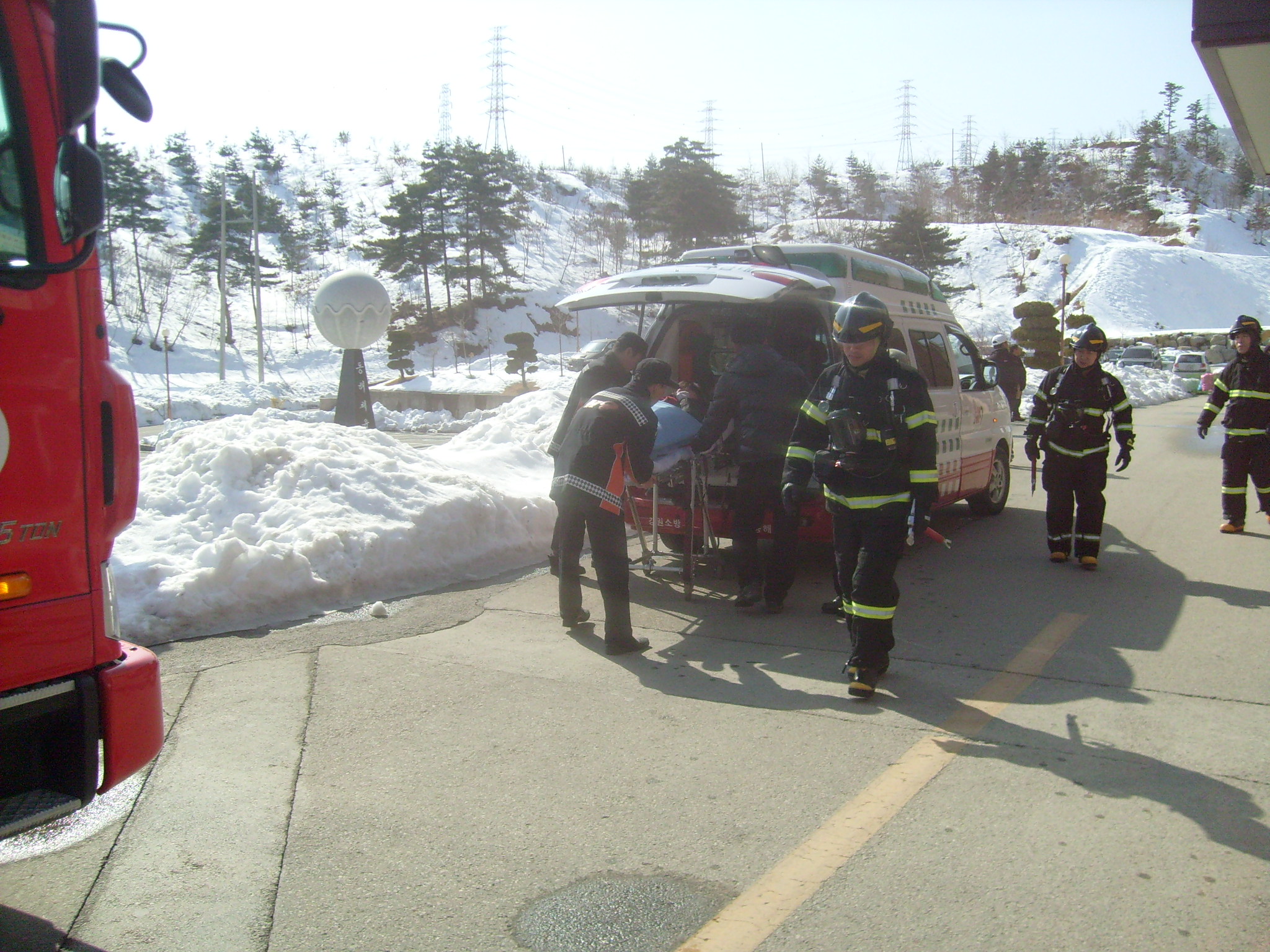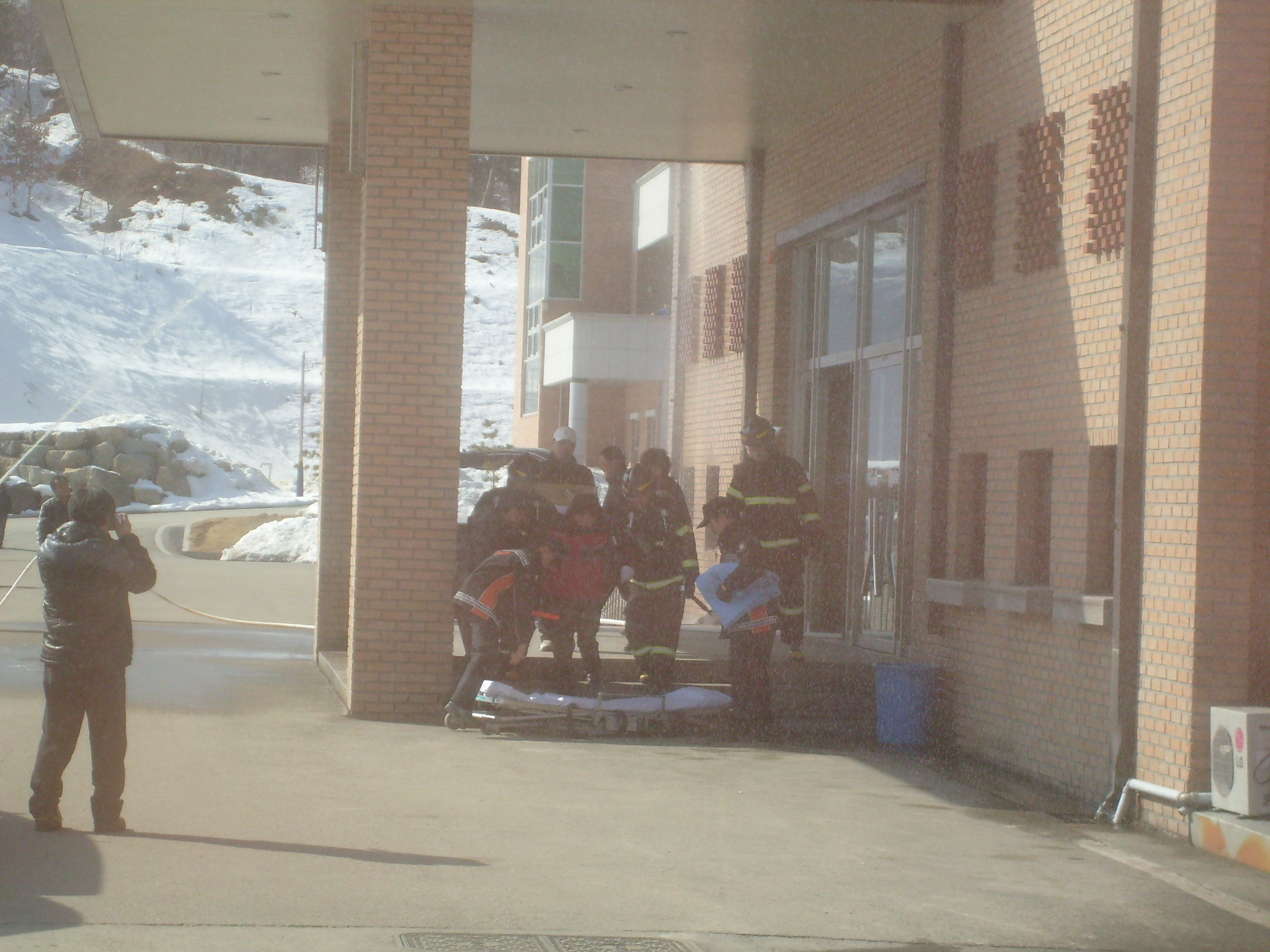 천곡센터장 유승용외 1팀 주간근무자 5명은 공공기관 합동 소방훈련차 동해웰빙레포츠타운으로 출동했다. 화재진압을 위한 차량의 동선파악 및 자위소방대의 진압훈련을 실시하였다. 레포츠타운내 동해체육관 2층 가상화재 진압을 위해 방수포로 방수하였으며 구급대원들의 환자이송훈련이 이어졌다.