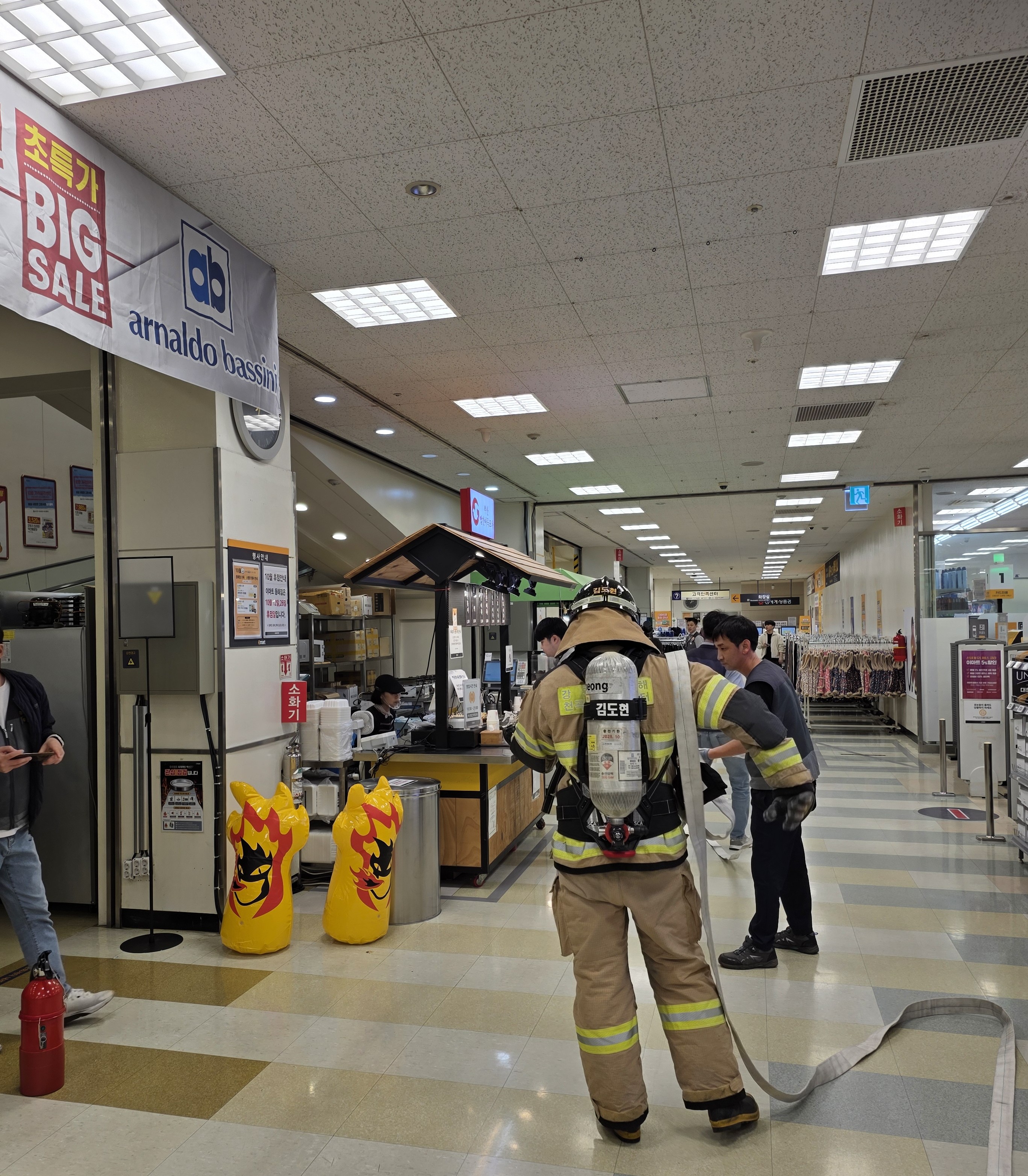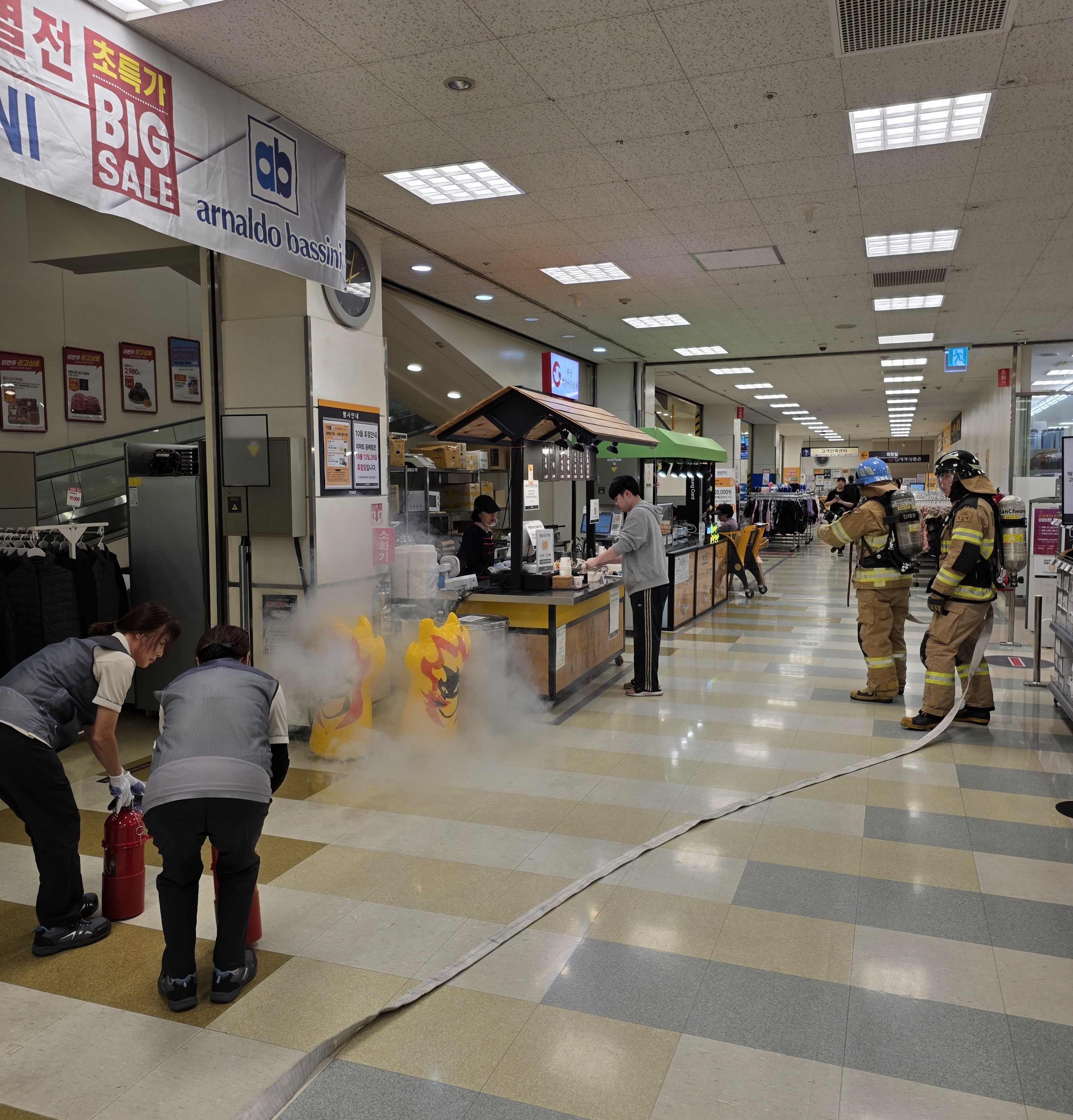 훈련은 화재 및 대테러 상황 발생을 가정하여 대형 판매시설 내 고객 및 직원의 신속한 대피와 초기 대응 능력 향상을 목표로 실시했으며, 실제 영업시간 중 훈련을 실시해 현장 대응 절차의 실효성과 고객 안전 확보 방안을 중점적으로 점검했다.