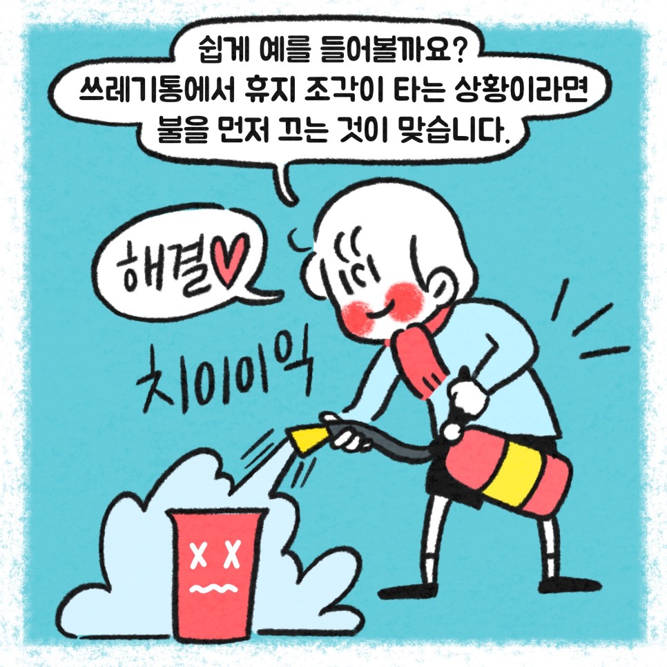 쓰레기통에서 휴지 조각이 타는 상황이라면 불을 먼저 끄는 것이 맞습니다.