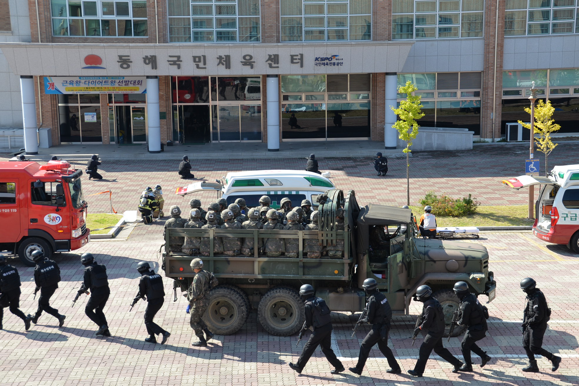 동해소방서(서장 주항중)는 7일(화) 오후2시 천곡동 국민체육센터에서 대테러 인질극 발생 대비, 긴급구조관련 26개 유관기관·단체 411명, 장비 58대가 동원되어 “2014년 재난대비 긴급구조 종합훈련”을 실시했다.