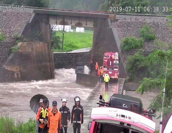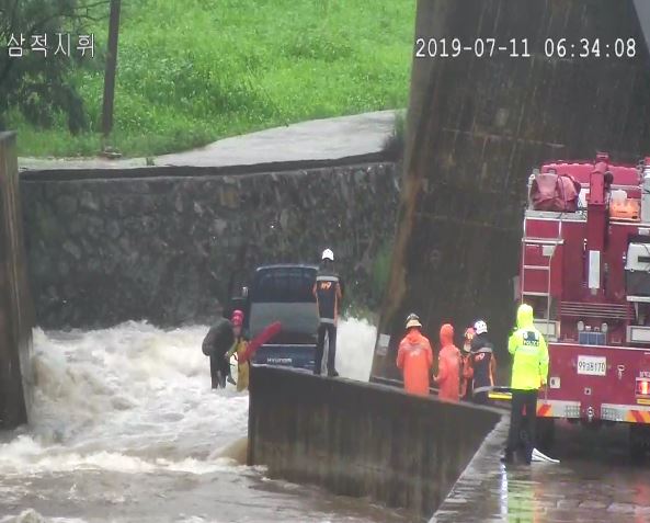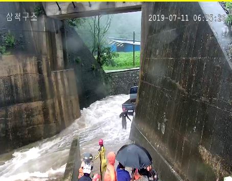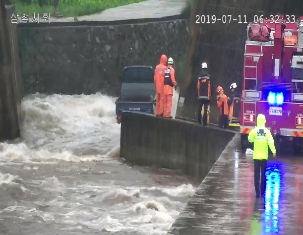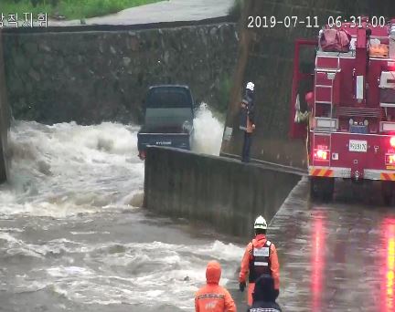 철길 밑 도로를 건너던 1톤 포터 트럭이 불어난 물에 고립되어 운전자 1명 구조함