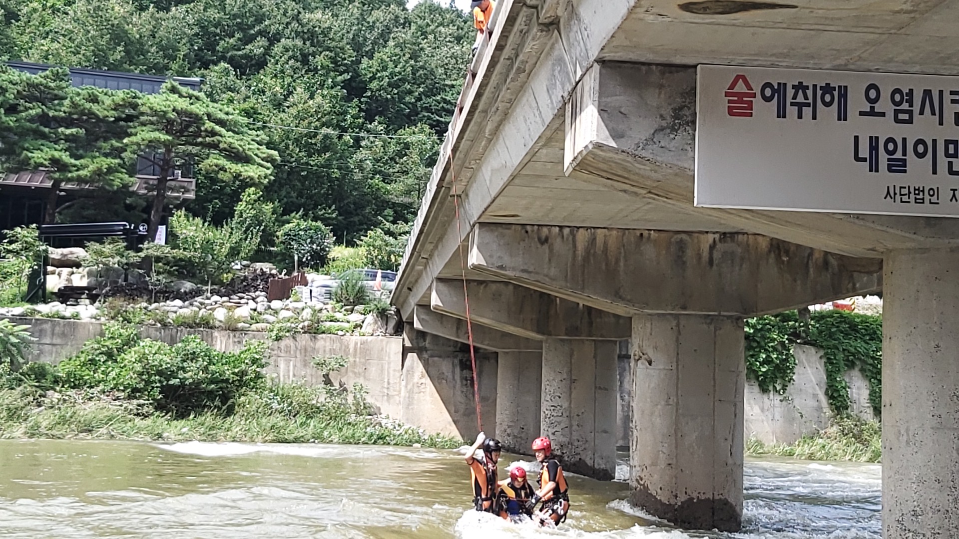 다리 교각밑으로 건너갔다가 거센 물살에 못나오는 상황 이었습니다.