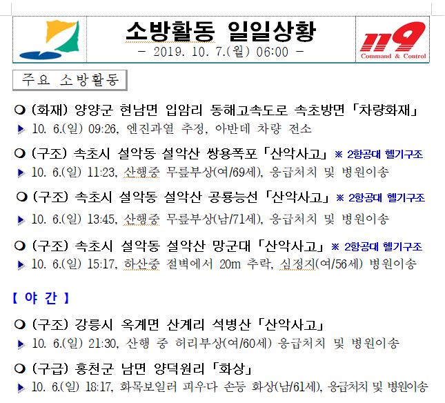 소방활동 일일상황 (10. 7. 월) 06:00
