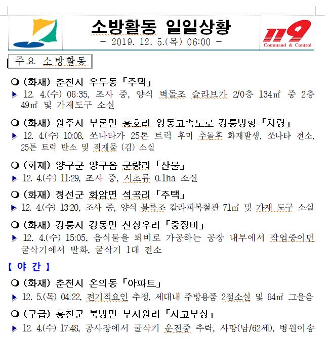 소방활동 일일상황(12. 5. 목) 06:00