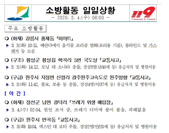 소방활동 일일상황 (3. 4. 수) 06:00