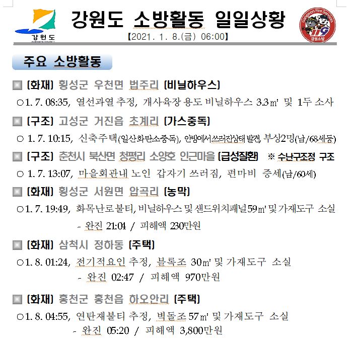 강원도 소방활동 일일상황(1. 8. 금) 06:00