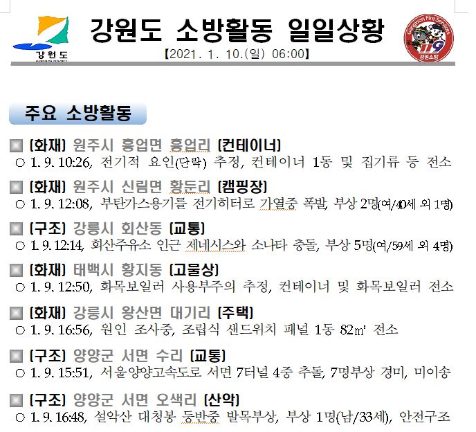강원도 소방활동 일일상황(1. 10. 일) 06:00