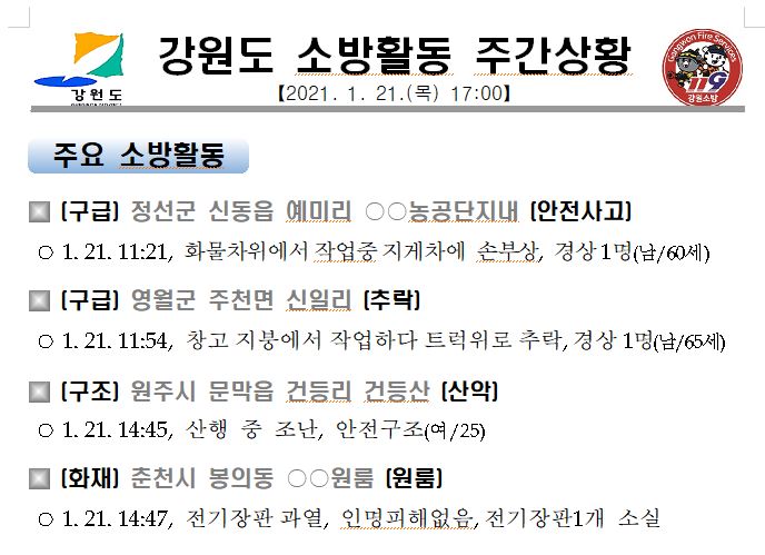 강원도 소방활동 주간상황(1. 21.목) 17:00