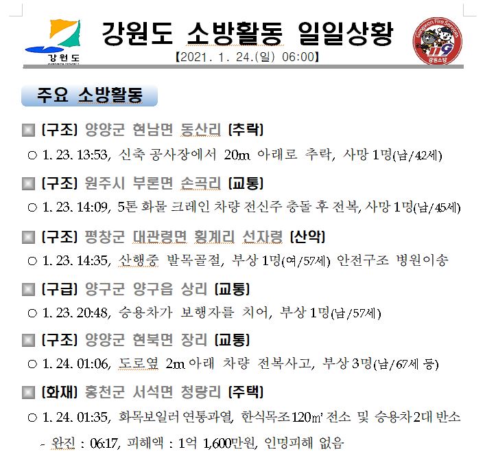 강원도 소방활동 일일상황(1. 24. 일) 06:00