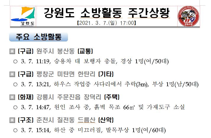 강원도 소방활동 주간상황(3. 7. 일) 17:00