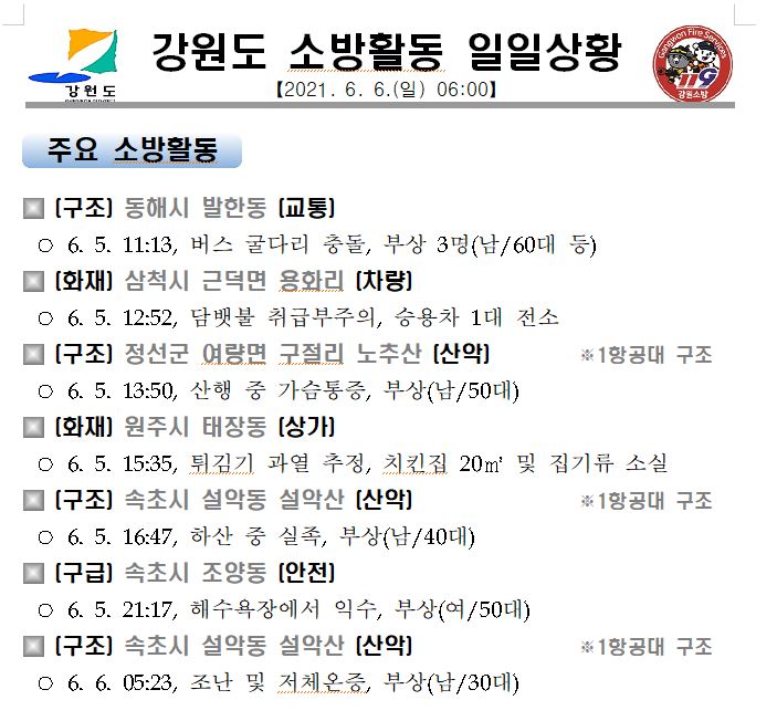 강원도 소방활동 일일상황 (6. 6. 일) 06:00