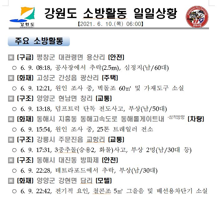강원도 소방활동 일일상황 (6. 10. 목) 06:00