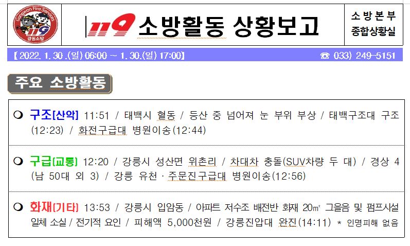119 소방활동 상황 보고(1. 30. 일) 17:00