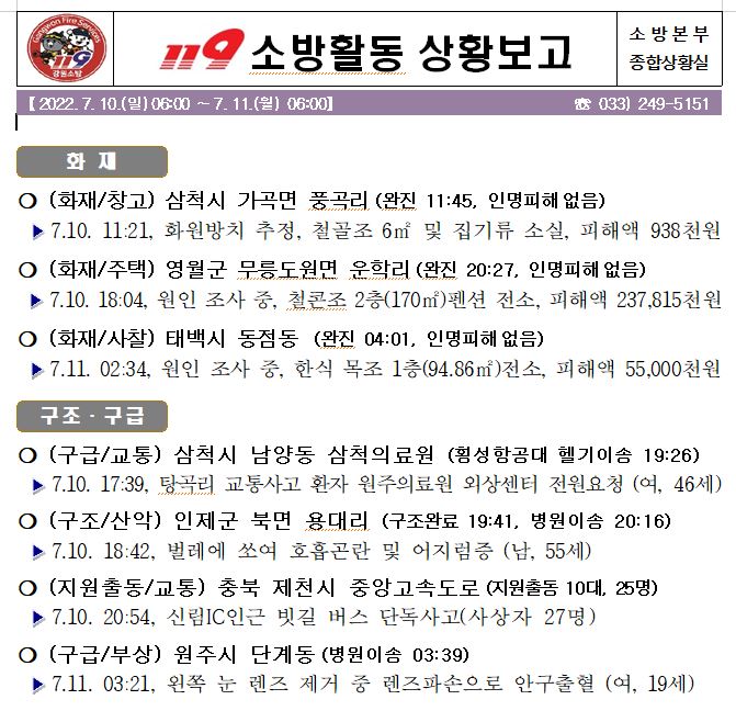 119 소방활동 상황보고(07. 11. 월) 06:00