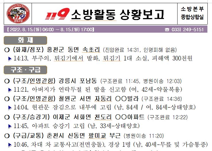 119 소방활동 상황보고(08. 15. 월) 17:00