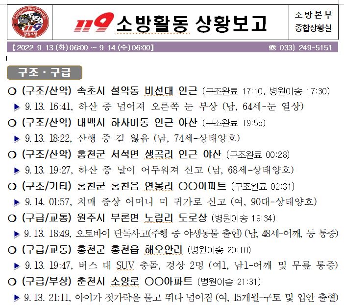119 소방활동 상황보고(9. 14. 수) 06:00