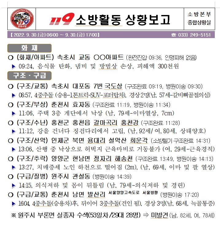 119 소방활동 상황보고(9. 30. 금) 17:00