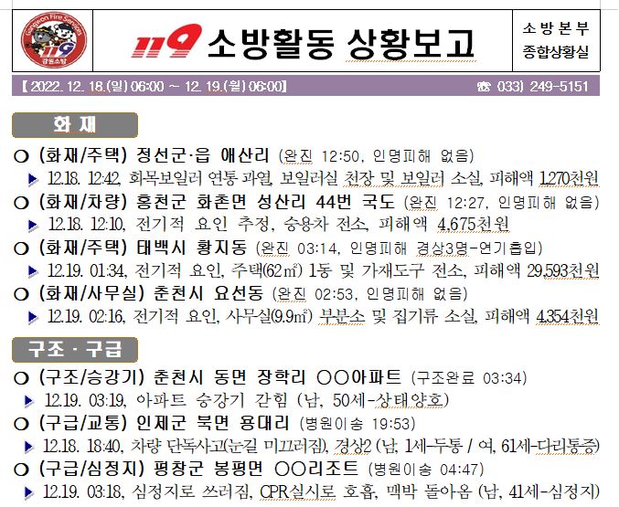 119 소방활동 상황보고(12. 19. 월) 06:00