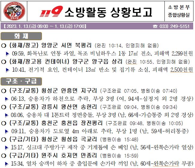 119 소방활동 상황보고(1. 13. 금) 17:00