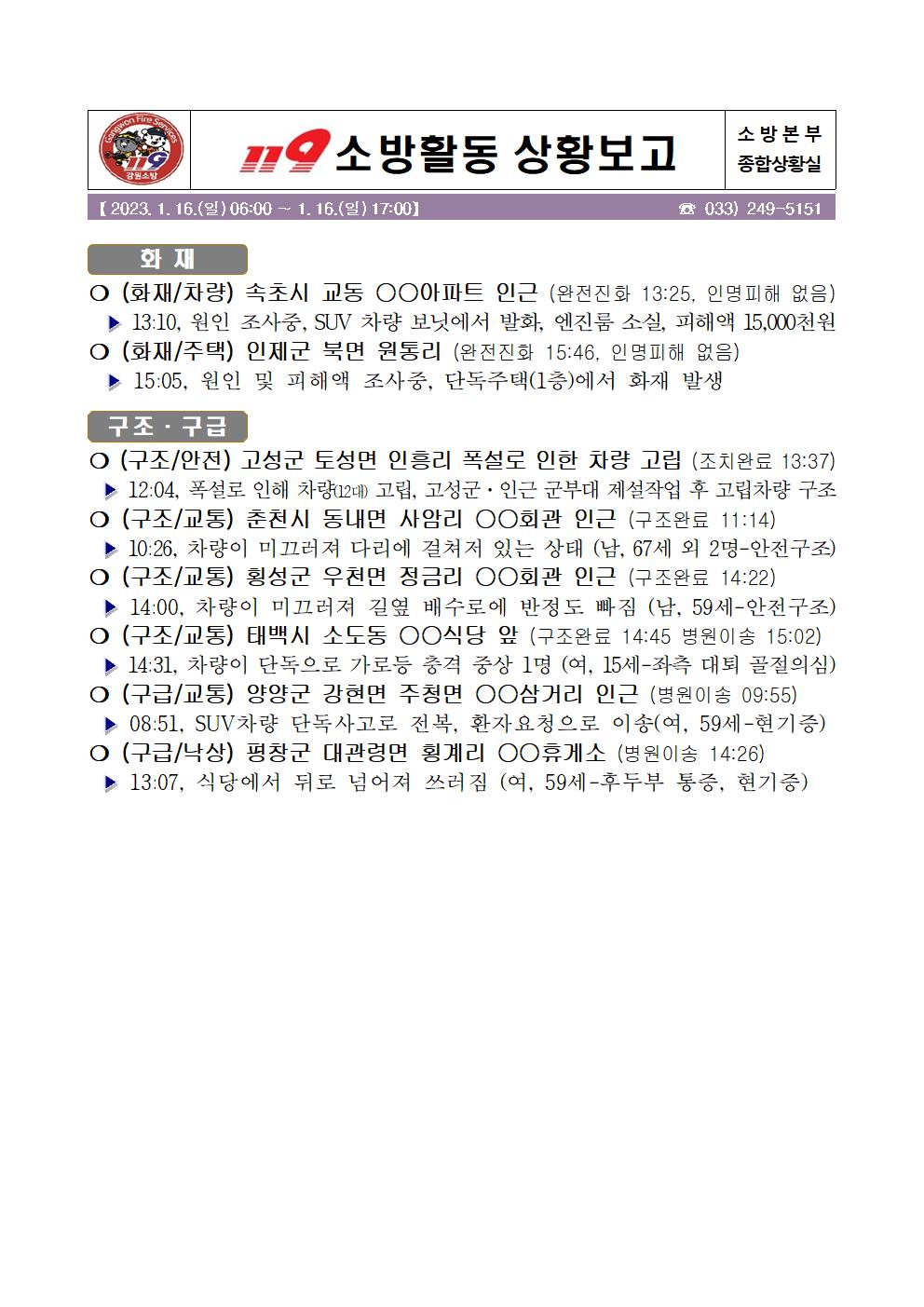 119 소방활동 상황보고(1. 16. 월) 06:00
