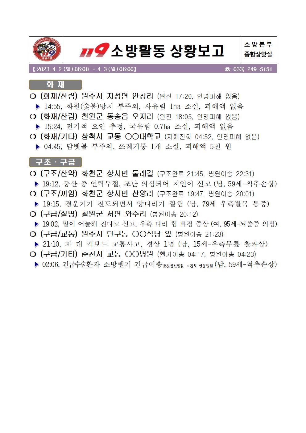 119 소방활동 상황보고(4. 3. 월) 06:00