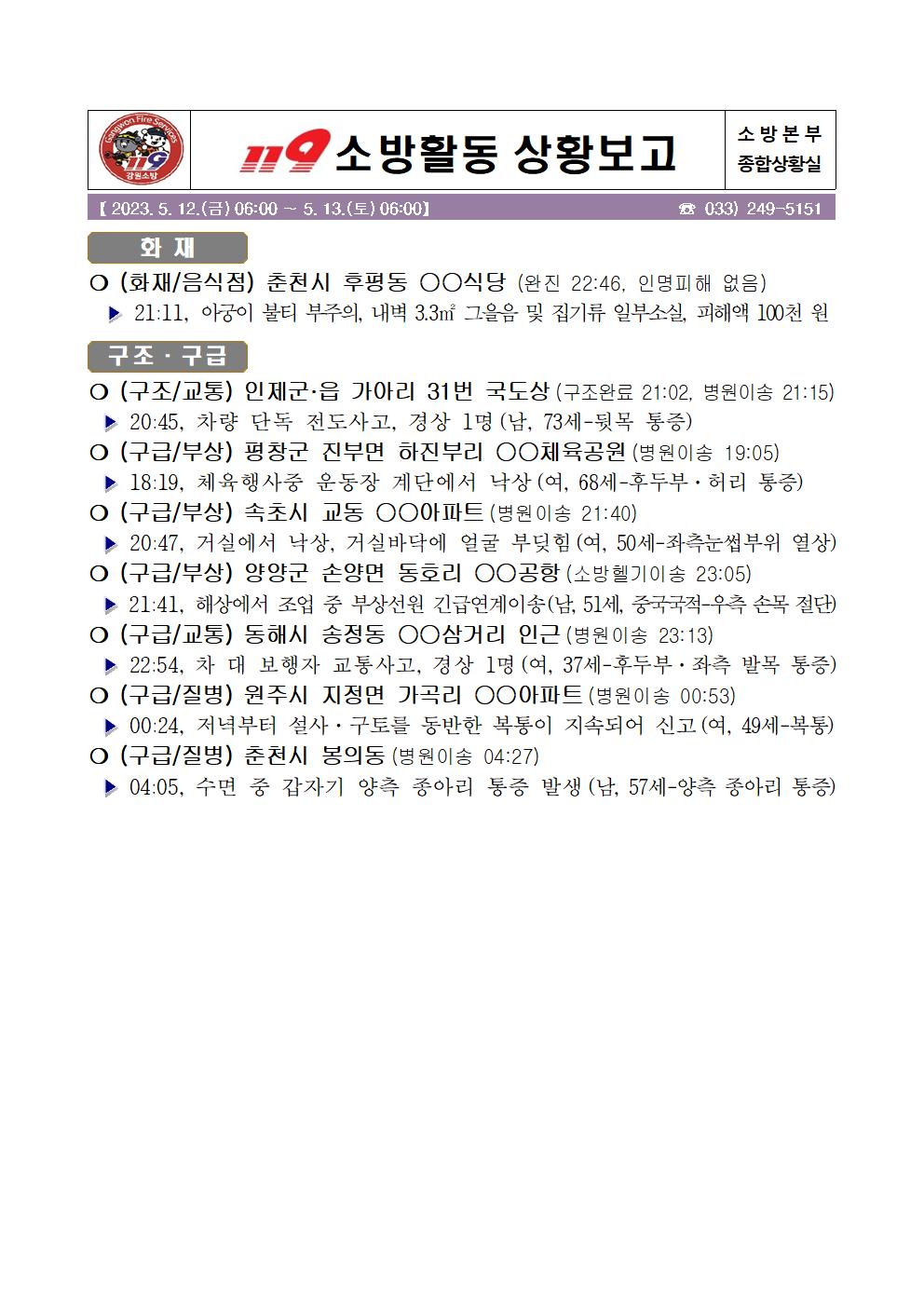 119 소방활동 상황보고(5.13.토) 06:00