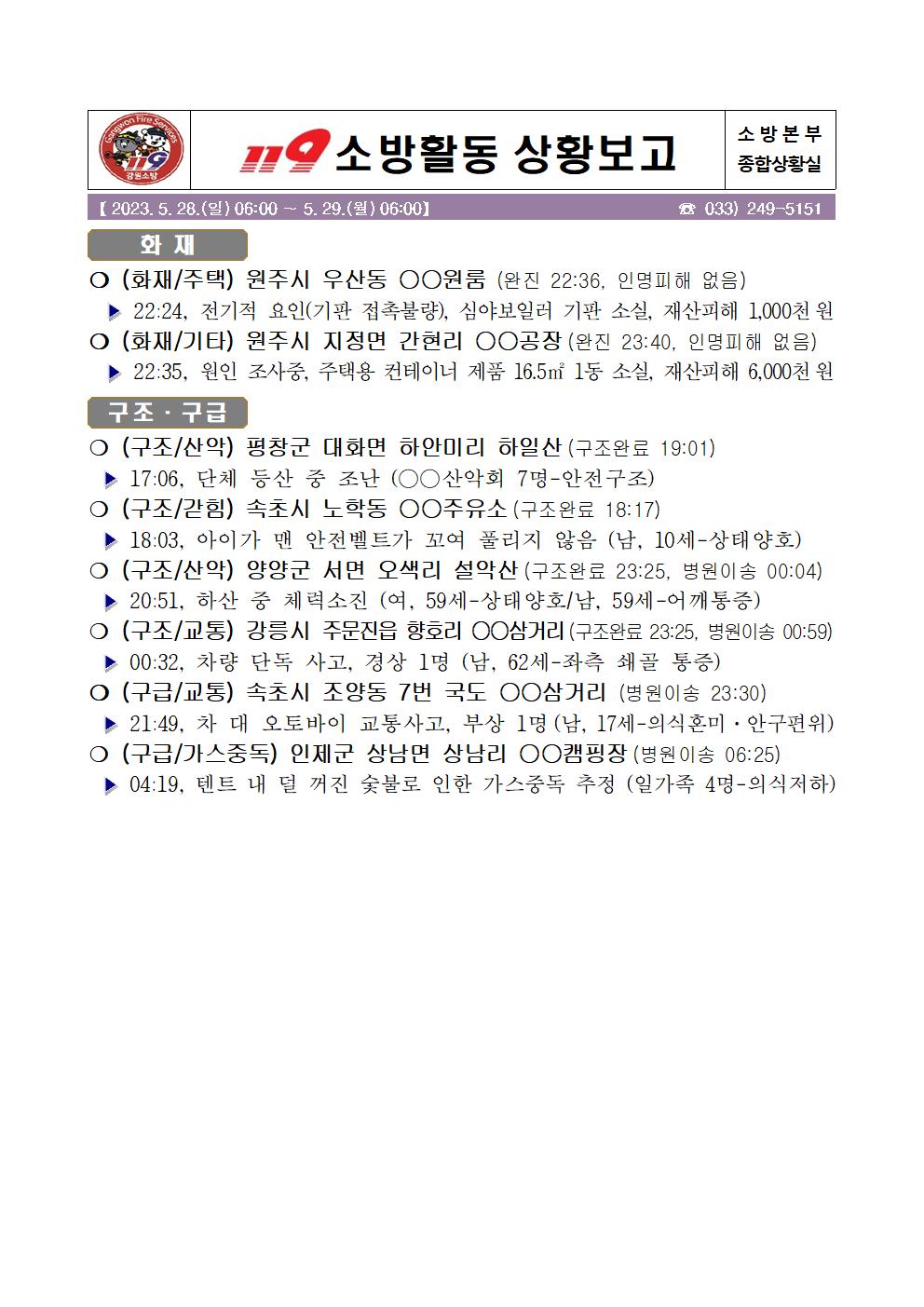 119 소방활동 일일상황보고(5.29.월) 06:00