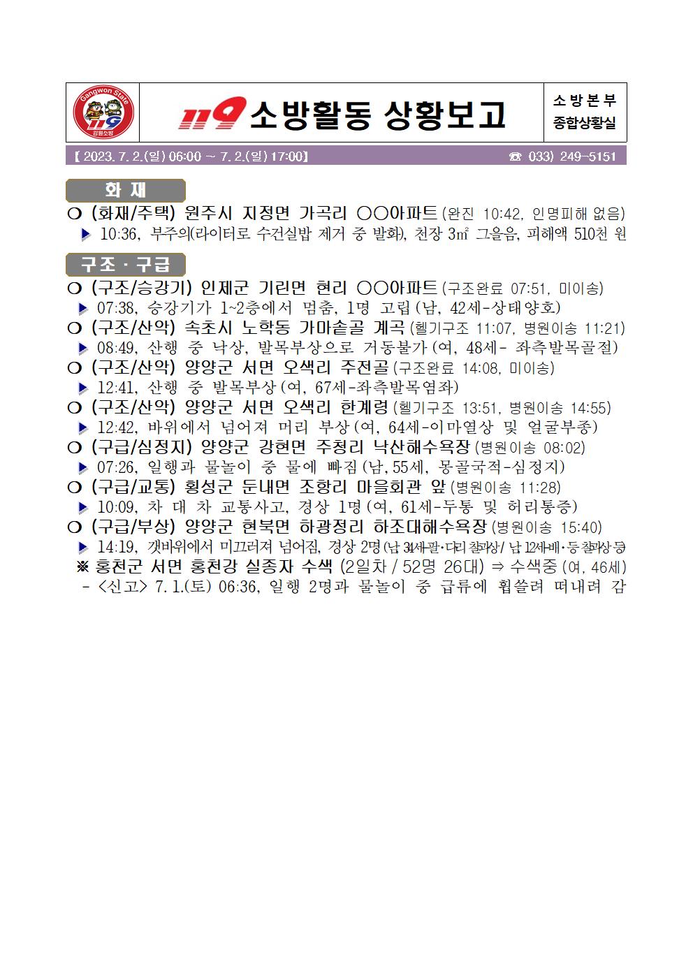 119 소방활동 일일상황보고(7.2.일) 17:00