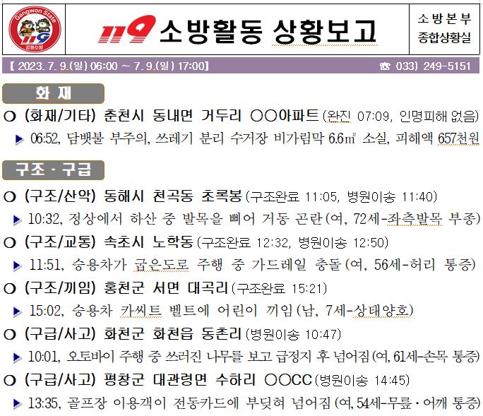 119 소방활동 일일상황보고(7. 9. 일) 17:00