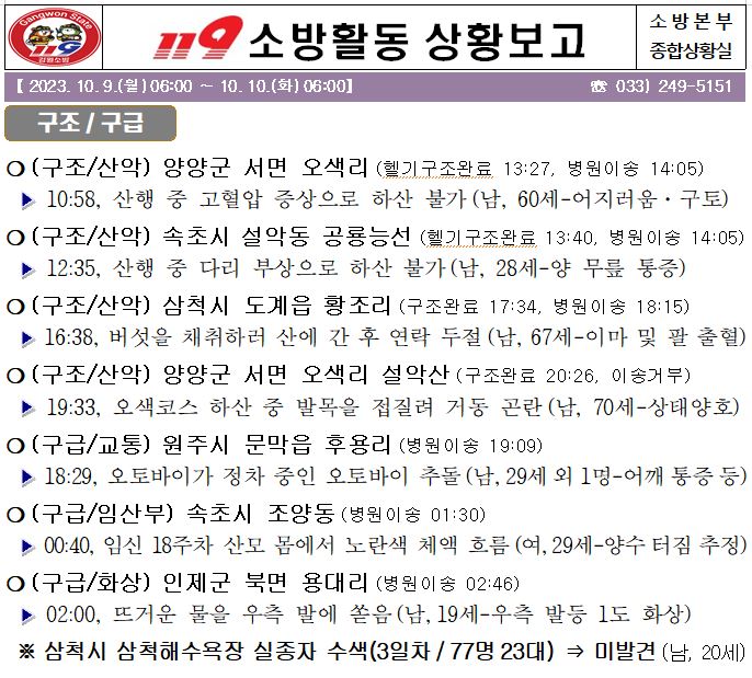 119 소방활동 상황보고(10. 10. 화) 06:00