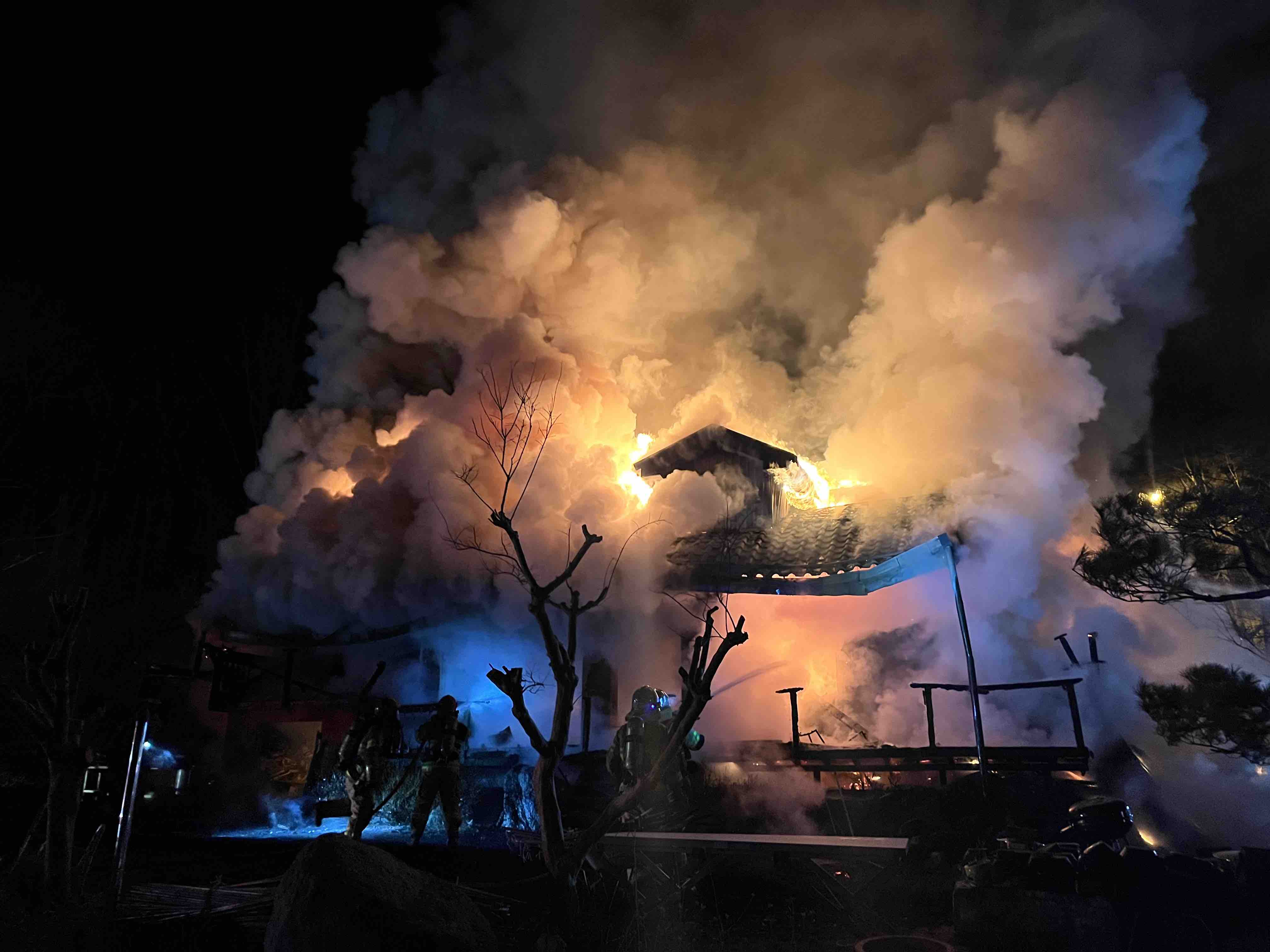 03:18~진압중, 화목 아궁이 불티 부주의, 주택 1동 79.92㎡ 전소(30,000천원), 인명피해 없음(1명 자력 대피, 남 70대)