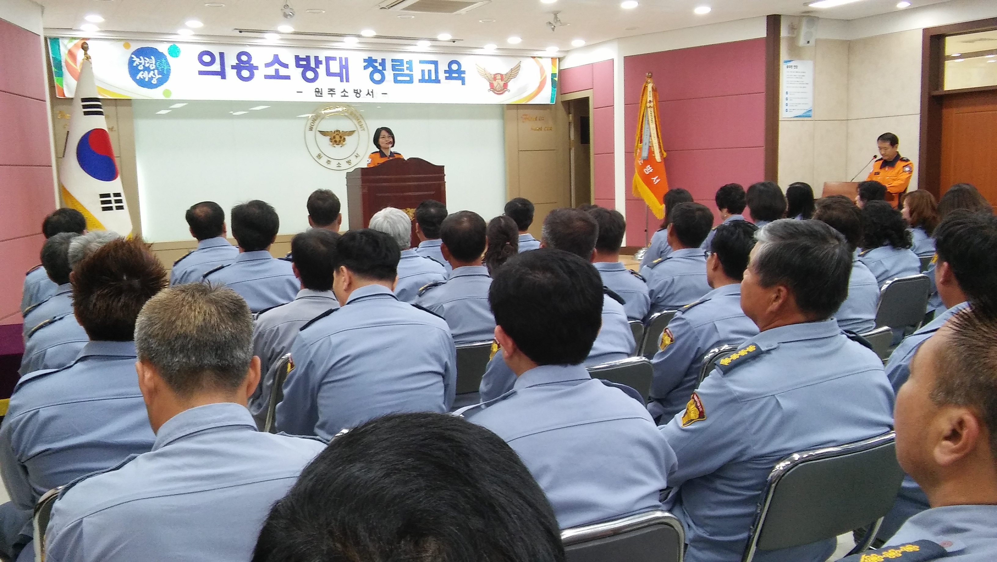 원주소방서(서장 원미숙)는 19일 오후 4시부터 소방서 대회의실에서 원주시 의용소방대원 80여명이 참석한 가운데 주택용 소방시설 설치지원 및 사후 관리를 위한 119생활안전지원단 교육과 의용소방대 청렴교육을 실시했다.