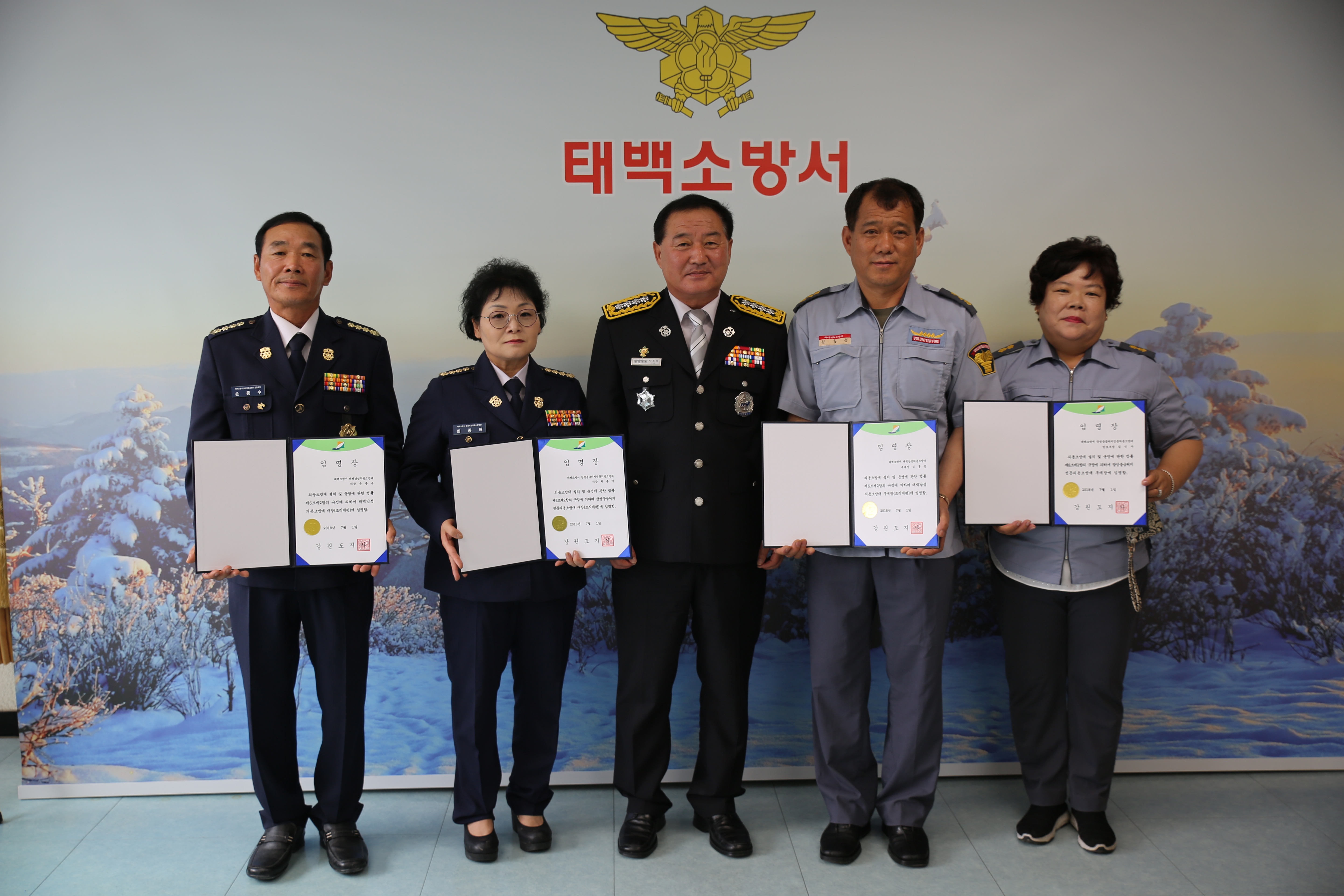 이날 행사는 2018.4.17.자 태백의소대 조직개편에 따른 태백산악전문대에서 태백남성의용소방대로, 장성여성지역대에서 장성응급처치전문의용소방대로 개편하고 임용장을 수여했다.