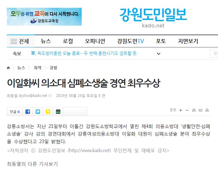 | 24087 | (강릉) 이일화 강릉여성의소대원 심폐소생술 경진대회 최우수상 수상 | 강릉홍보 | 2019-08-23 | 355 | |