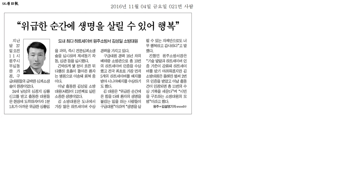 | 20762 | (원주)심정지 환자를 11명째 살린 소방관 | 원주홍보 | 2016-11-04 | 118 | |