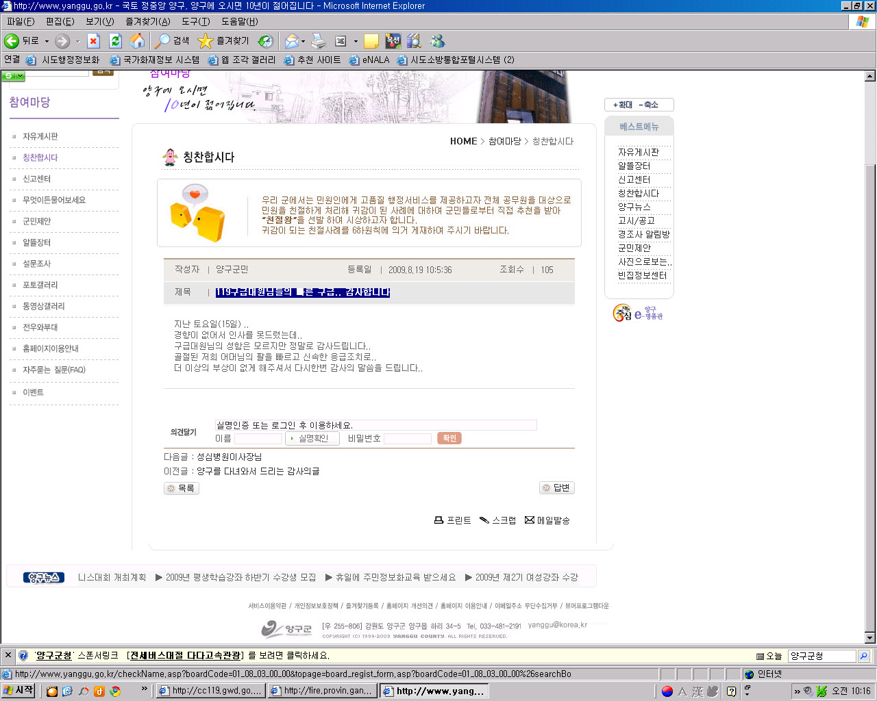 2009. 8. 19일자 10시5분36초 "양구군 홈페이지" - " 참여마당" - "칭찬합시다" 란에 올라온 게시물에