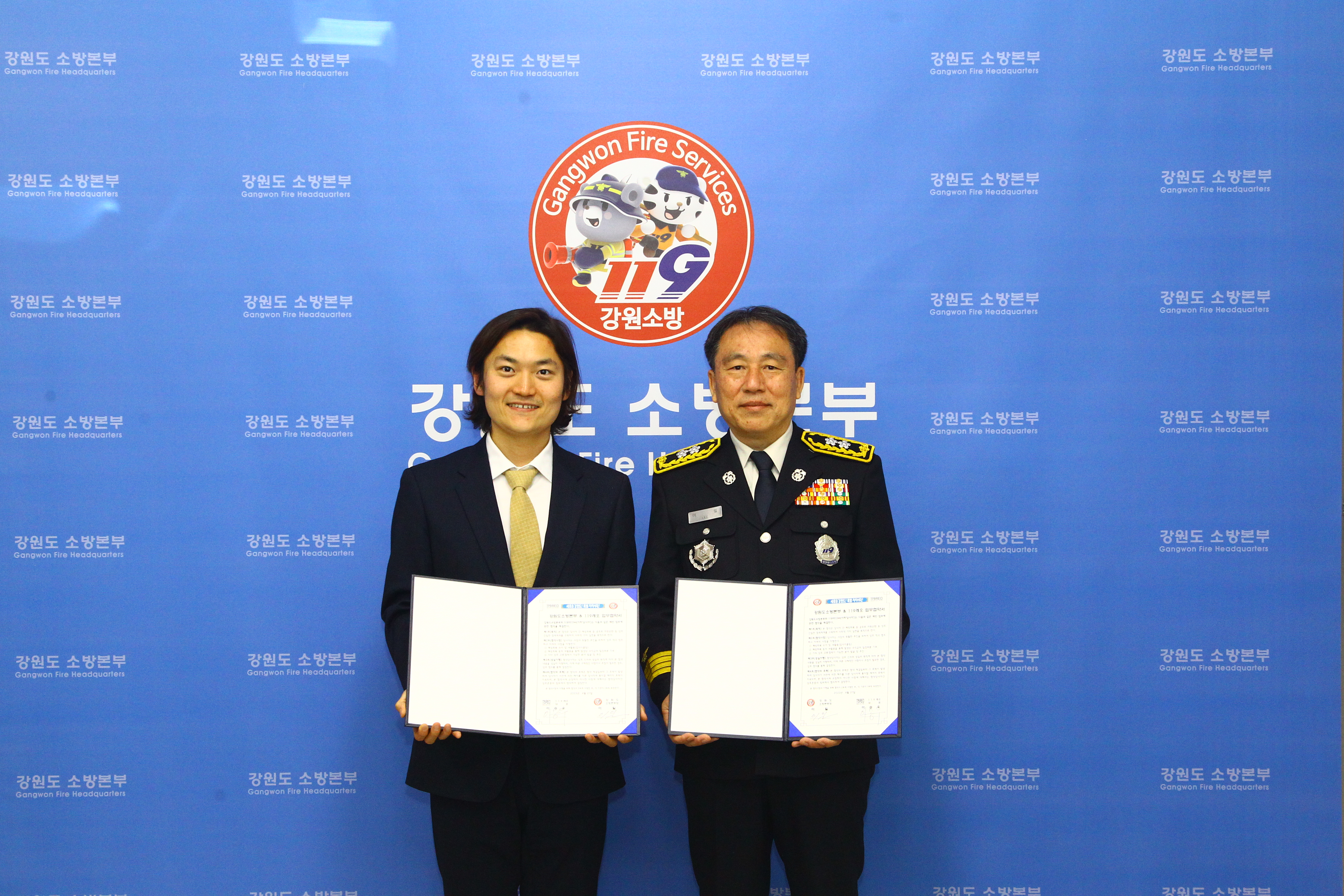 ○ 강원도소방본부는 27일 14시 본부장실에서 소방관들이 사용한 폐방화복과 소방호스, 소방피복 등의 재활용을 통해 사회적 공익을 창출할 목적으로 119REO(주)와 업무협약식을 가졌다.