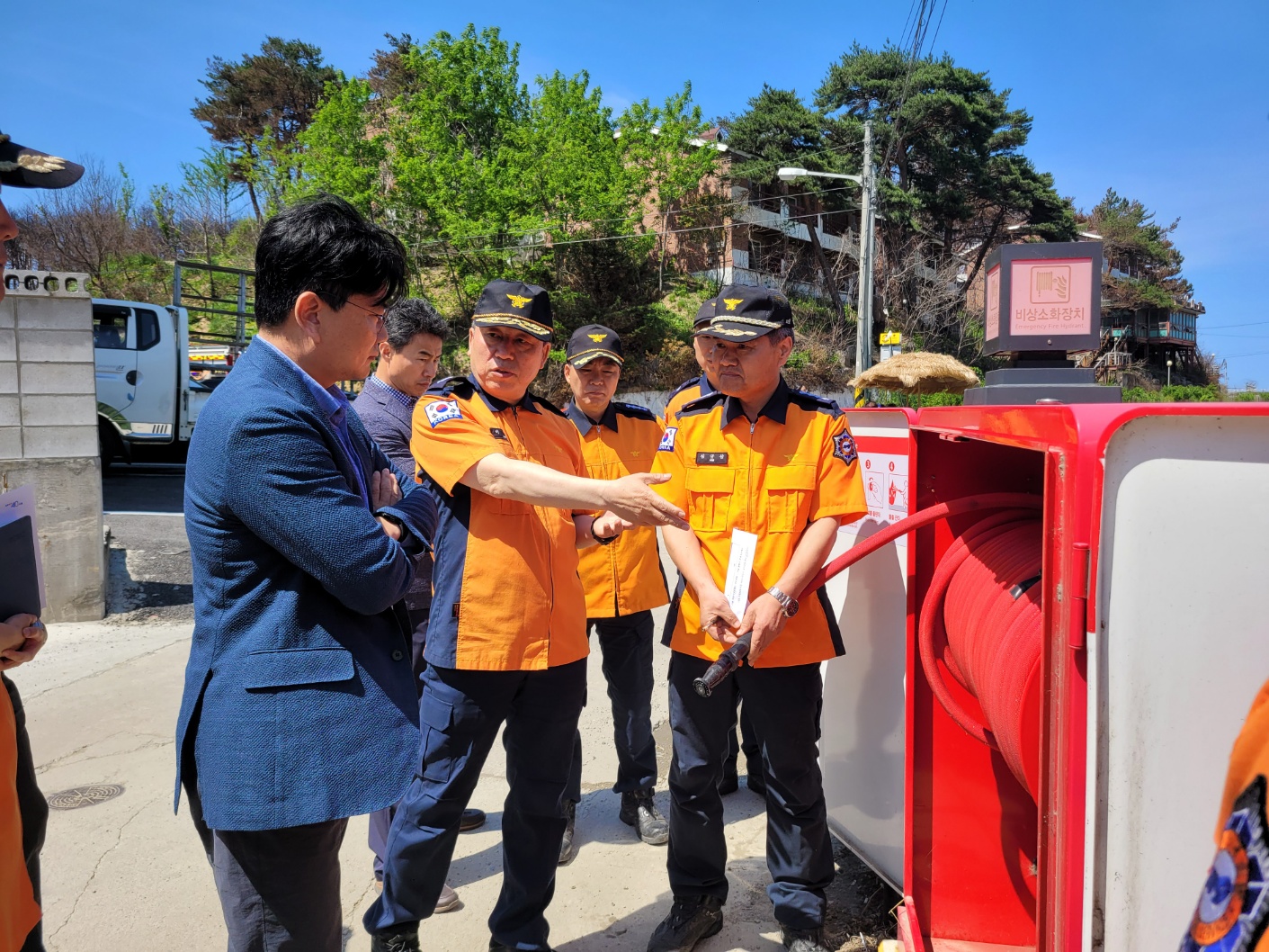 ○ 이 본부장은 험지펌프차량과 실재 설치되어 있는 비상소화장치함으로 안내하여 지난 강릉화재시 실재 적응사례를 들면서 확충 필요성을 일일이 설명했다.